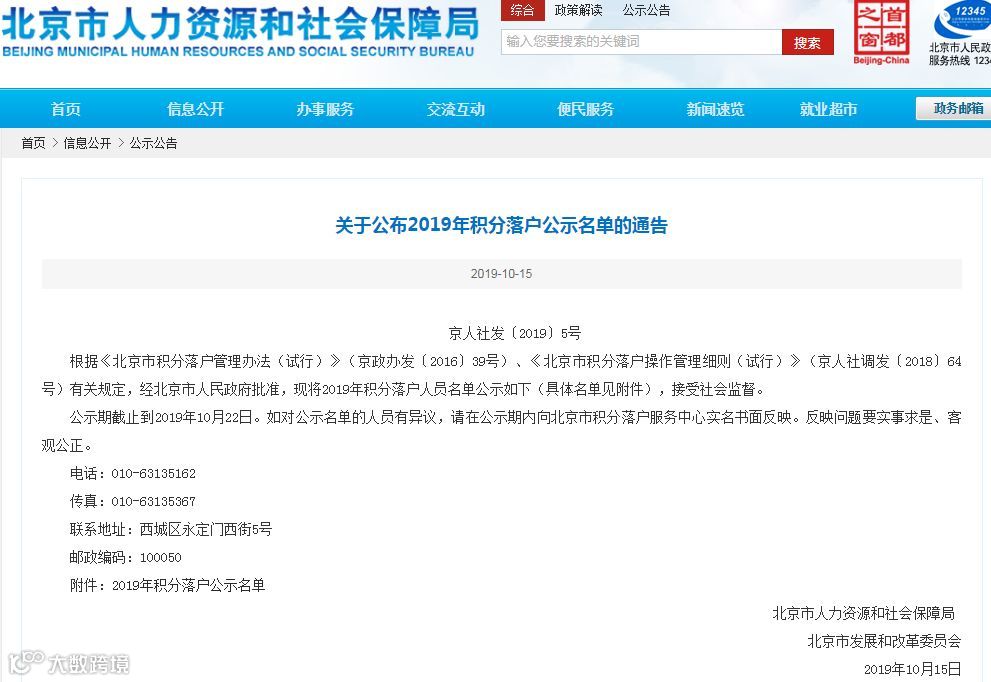 10月15日,北京市人力资源和社会保障局发布消息称,北京市2019年积分落户申报审核工作已全部结束,自10月15日起进入公示阶段。