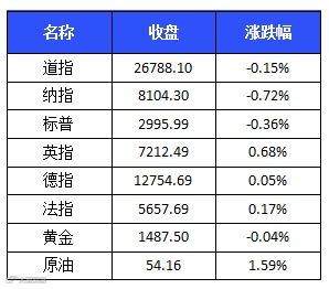 美三大股指周二小幅下跌。截至收盘,道琼斯指数下跌39.54点,跌幅0.15%,报26788.10点;标普500指数下跌10.73点,跌幅0.36%,报2995.99点;纳斯达克指数下跌58.69点,跌幅0.72%,报8104.30点。