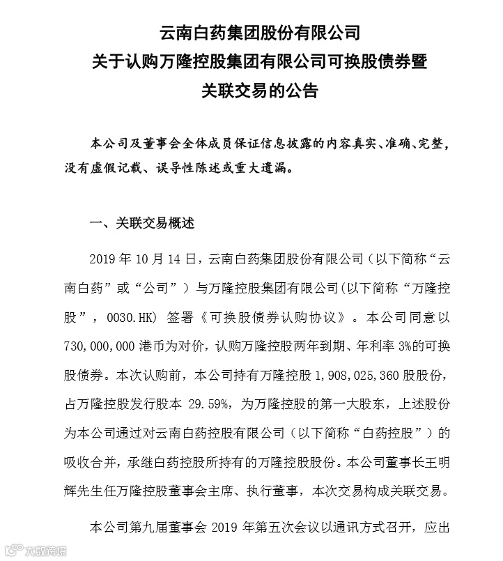 公告称,拟斥资7.3亿港元,认购港股上市公司万隆控股的可换股债券。云南白药是这家公司的第一大股东,持股比例为29.59%。