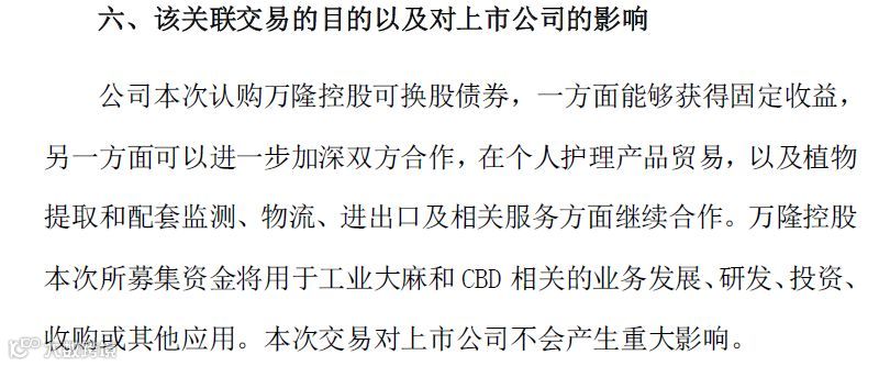关键在于募集资金的用途。公告称,募集资金将用于工业大麻和CBD相关业务发展、研发、投资、收购或其他应用。CBD即大麻二酚。
