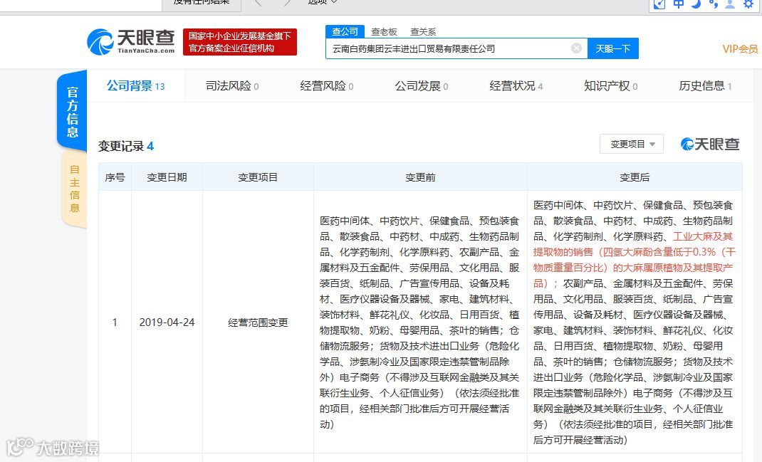 不止于此,云南白药通过旗下子公司或孙公司在不断的扩大版图。天眼查显示,云南白药的孙公司云南白药集团云丰进出口贸易有限责任公司,于2019年4月24日进行了一次经营范围的变更,经营范围增加了“工业大麻及其提取物的销售”一项。