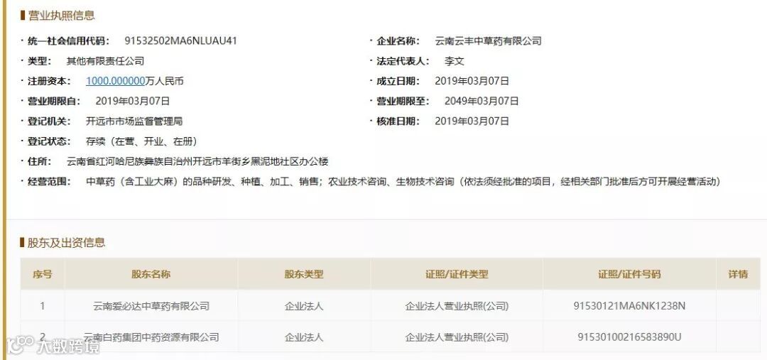 国家企业信用信息公示系统显示,云南云丰中草药有限公司成立于2019年3月,法定代表人为李文,注册资本1000万元。经营范围为中草药(含工业大麻)的品种研发、种植、加工、销售等。公司的股东包括云南爱必达中草药有限公司和云南白药集团中药资源有限公司。