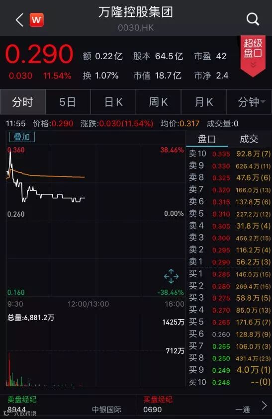 受消息的提振,万隆控股15日早盘股价最高飙升逾36%,创两年内新高。而随着公司股价升至最高点后,股价有所回落,截至11:54,公司股价报0.29港元,上涨11.54%。