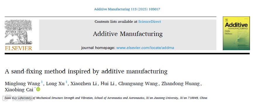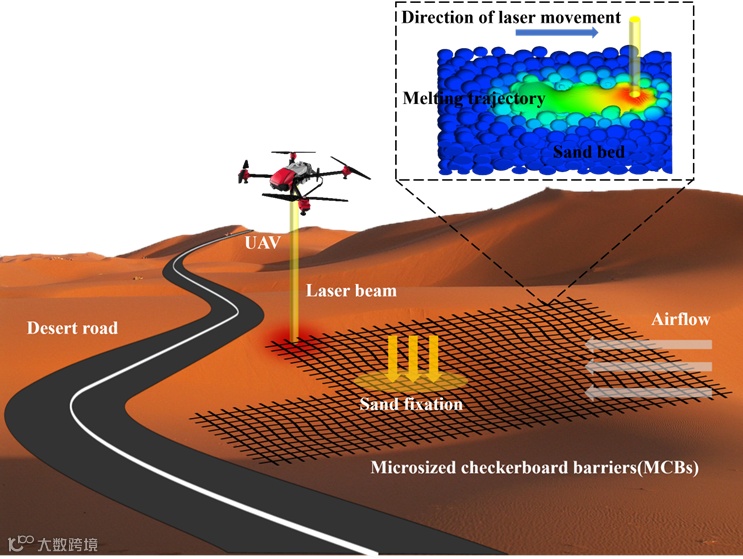 当传统草方格固沙还在依赖人工铺设、耗时耗力时,一项融合低空经济与先进制造技术的创新方案横空出世。西安交通大学航天航空学院蔡小兵团队提出的无人机激光固沙技术,通过北斗导航精准定位,让无人机携带激光设备在沙漠表面烧蚀形成毫米级网格(MCBs),无需人工、仅耗电力即可实现全自动化固沙,相关成果发表于机械类顶级期刊《Additive Manufacturing》,获得国际同行高度认可。