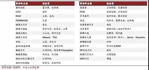 据中金公司研报,华为Mate 20 X 5G整机组装供应商包括比亚迪,摄像头模组供应商有欧菲光,盖板供应商有蓝思科技,面板供应商有京东方A,触控芯片和指纹识别供应商有汇顶科技,触摸屏模组供应商有同兴达和合力泰,连接器供应商有立讯精密和长盈精密,PCB供应商有深南电路和沪电股份,声学器件供应商有歌尔股份,电池供应商有欣旺达和德赛电池以及比亚迪、射频天线供应商有硕贝德。