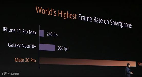 发布会现场,余承东将Mate30 Pro与目前其他品牌旗舰手机对比。iPhone 11 Pro Max仅支持240帧慢动作,三星Galaxy Note 10+支持960帧慢动作,而Mate30 Pro支持7680帧超慢速拍摄。