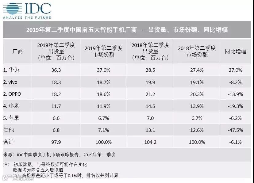 但从中国市场来看,仅有华为在第二季度销量大幅上涨,苹果等厂商销量同比均是下滑。IDC数据显示,2019年第二季度,华为在中国智能手机市场份额为37%,苹果市场份额仅为6.7%。