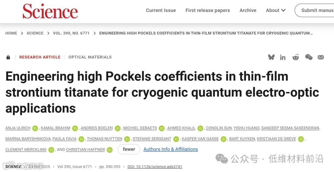 为了解决这一难题,欧洲微电子研究中心(IMEC)Anja Ulrich,Kamal Brahim,Andries Boelen,Christian Haffner团队在“Science”期刊上发表了题为“Engineering high Pockels coefficients in thin-film strontium titanate for cryogenic quantum electro-optic applications”的最新论文。该团队通过工程化薄膜 SrTiO3 打破其对称性:SrTiO3 外延生长在硅上,并通过晶圆键合转移到 SiO2 衬底上。薄膜略微富 Ti,结合应变效应,将 TC 提升至约 100 K,高于量子涨落临界点,从而实现对称性破缺铁电相,同时保持由晶格共振引起的高介电率。结合近期在掺同位素 SrTiO3 中观察到的二次电光效应(Kerr 效应),该研究表明薄膜 SrTiO3 在低温电光性能上可超越传统 Pockels 材料。