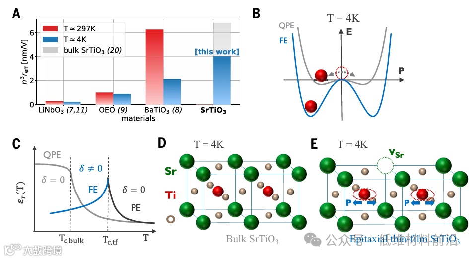 针对低温应用,理论上 TC 接近操作温度的材料较为理想,但通常受量子涨落阻碍铁电相变。钛酸锶(SrTiO3)在 TC ≈ 37 K 时,由于量子涨落抑制了铁电相变,表现为量子介电(quantum paraelectric)相,Ti 原子不能局域化,导致高极化率但 Pockels 系数为零。
