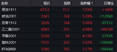 据Wind 数据,9月16日早间,国内原油、燃料油、沥青期货主力合约均涨停开盘。其中,原油期货主力合约涨停价477.5元/桶,创下5月24日以来新高,此后涨停板打开,涨幅收窄。截至收盘,原油期货报473.3元/桶,涨幅7.03%;燃油期货和沥青期货主力合约分别上涨5.59%和5.36%。