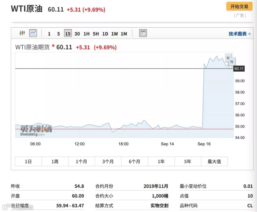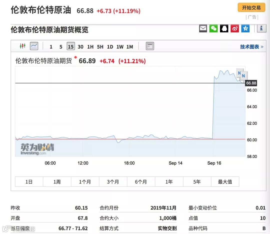 9月16日,布伦特原油最高一度涨近19%,创1991年以来的28年最大日内涨幅。