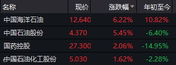 港股市场上,在大市开盘走弱背景下,“三桶油”逆市走高。截至午间收盘,中国海洋石油、中国石油股份和中国石油化工股份分别上涨6.22%、5.45%和1.62%。