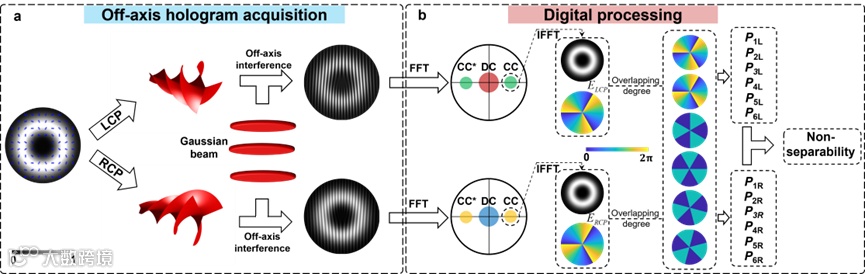 图1. 矢量结构光束不可分性相干探测方案原理图。(a)离轴全息图获取过程(b)数字域处理过程。