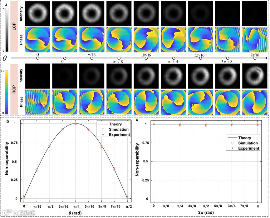 在发生变化,如图2(c)所示。对于每一组实验结果,都连续测量50张离轴全息图来获取50次测量的结果,并计算标准差并标注在图上。图2(a)展示了两个涡旋光束分量的功率比变化的过程中,对两个自旋通道下光场复波前测量的结果。图2(b)和(c)中的实验结果与理论和仿真结果误差较小,且50次测量具有较高稳定性。