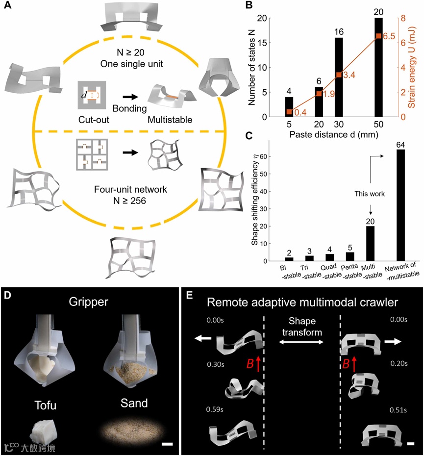 可响应外界刺激并实现形状变换的材料具备高度环境适应性,在柔性力学超材料、可重构软体机器人、自适应医疗装置及空间探索等领域具有广泛应用。实现形变的策略主要包括基于刚性旋转的机械机构和基于柔性结构的弹性变形。相比刚性系统,柔性结构可实现连续可控的弯曲、拉伸与扭转形态,并利用软性活性材料实现自适应形变。双稳态与多稳态结构(如捕蝇草与折纸结构)因能在多个稳定状态间快速、可逆切换而被广泛研究,其通过储存弹性能在无持续驱动下保持形态。当前多稳态超结构已应用于高效抓取、跳跃与游动等,但其在多模式、地形自适应运动方面的潜力尚未充分挖掘。受限于结构复杂度与驱动控制难度,形变效率普遍较低。理想策略是提升单元结构的稳定状态数量,以提高形变效率并简化驱动,实现高适应性、多功能的可重构软体机器人平台。