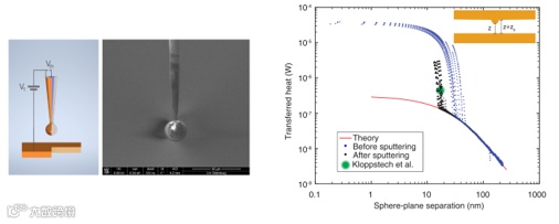 为回答这一关键问题,德国卡尔·冯·奥西茨基大学(Carl-von-Ossietzky University Oldenburg)A. Kittel教授与S.-A. Biehs教授团队首次系统报道了从近场向极近场过渡的辐射热传递实验观测。他们基于近场扫描热显微镜(Near-field Scanning Thermal Microscope, NSThM),在超高真空条件下构建了金镀层球–金平面体系,通过在探针前端粘附直径20 μm的二氧化硅球并整体镀金,有效拓宽了可测量的间距范围(可达250 nm),同时保持亚纳米级的接触定位精度。研究者通过施加隧穿电压精确定义零距离点,并在逐步接近过程中实时记录热电电压信号,以此推算球–面间的辐射热流。结果显示:当间距大于30 nm时,实验数据与FED理论完全一致;而当间距小于18 nm时,热流出现急剧上升,最大值比理论预期高出约两个数量级。更为关键的是,即便经过原位氩离子溅射清洁以去除所有可能的分子桥与表面污染,这种增强依然存在,排除了分子导热或金–金接触传热的可能性。研究团队进一步分析了隧穿电流与热流随距离的同步变化,发现电子导通电流与热传递增强在尺度上并不同步,这暗示传统的电子或声子隧穿模型仍难以解释观测结果。该成果不仅提供了近场与极近场辐射热传递之间“连续跨越”实验证据,也揭示了现有涨落电动力学理论在纳米尺度下的局限性,为未来建立包含量子隧穿、电子波函数重叠以及界面局域模态贡献的统一理论框架提供了重要基准。论文指出,这一研究验证了经典理论在数十纳米尺度的可靠性,同时明确标识出其失效边界——当真空间隙小于约20 nm时,能量传递机制显然不再仅由宏观涨落场主导。