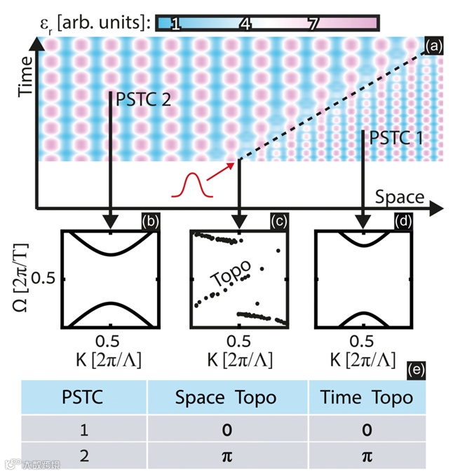 理论上已在光子时间晶体中预测到拓扑相,并在合成维系统中获得了实验验证。然而,由于时间仅为一维,因此 PTC 中的拓扑边界态在本质上是零维,无法支持沿系统边界的拓扑保护传输。这一限制引出了一个核心问题:能否在系统中引入一个周期性的空间维度,从而构建空间–时间光子晶体,实现一个在二维(1D空间 + 1D时间)中展现拓扑保护边缘传输的体系?