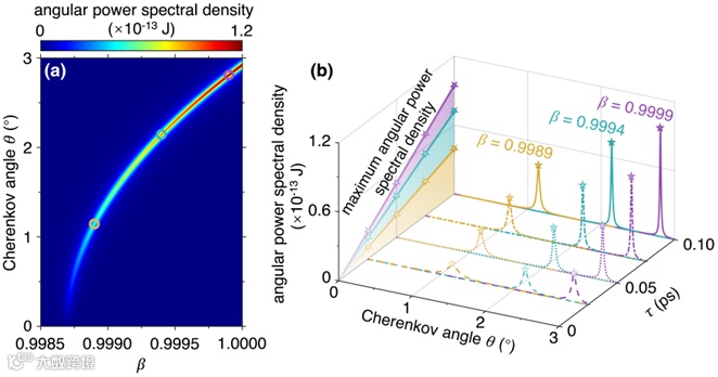 图3. 发射TE石墨烯等离激元的带电粒子能量损失。(a) 在弛豫时间𝜏 = 0.1 ps下,角功率谱密度随归一化粒子速度𝛽和切伦科夫角𝜃的变化关系。(b) 弛豫时间对角功率谱密度的影响。