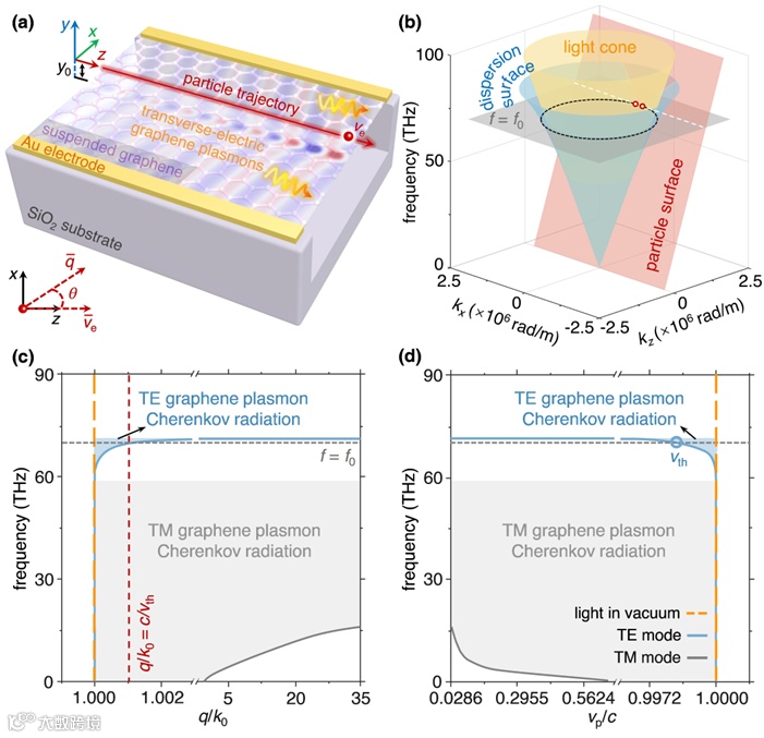 图1. TE石墨烯等离子激元切伦科夫辐射原理图。(a) 结构示意图。(b) 色散曲面。(c)TE与TM石墨烯等离激元切伦科夫辐射的截止频率。(d) TE与TM石墨烯等离激元切伦科夫辐射的速度阈值。