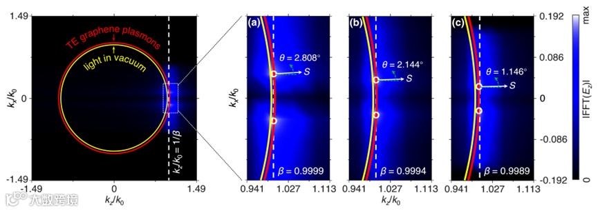 图2. TE石墨烯等离激元切伦科夫辐射的傅里叶谱。(a-c) 所研究的带电粒子速度分别为0.9999c、0.9994c和0.9989c,对应的辐射角分别为2.808°、2.144°和1.146°。