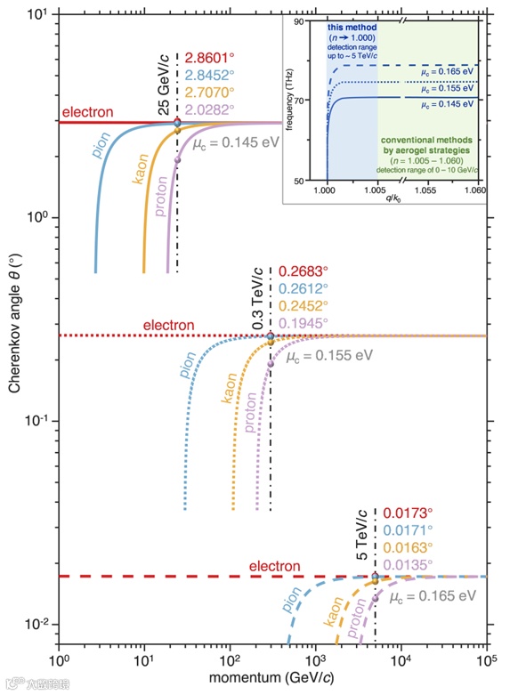 图4. 基于TE石墨烯等离激元切伦科夫辐射的粒子探测性能。四种基本带电粒子(电子、π介子、K介子和质子)的切伦科夫角𝜃与粒子动量关系图。
