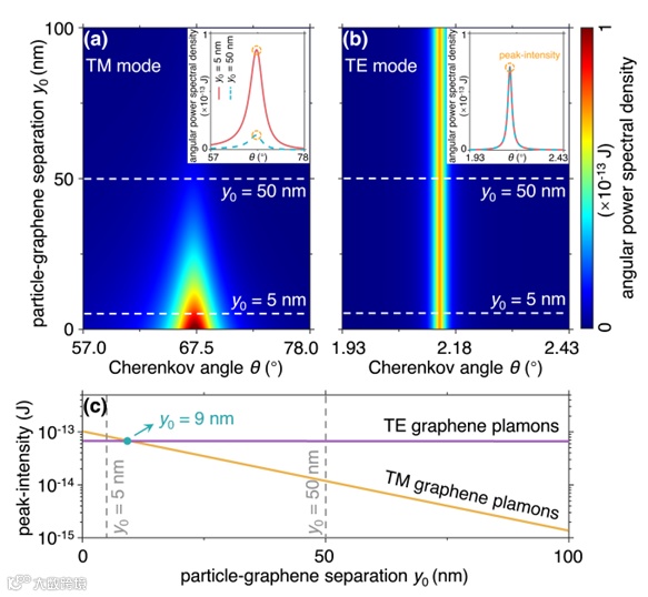图5. 带电粒子-石墨烯间距y0对石墨烯等离激元切伦科夫辐射发射强度的影响。角功率谱密度随辐射角𝜃和粒子-石墨烯间距y0的变化关系:(a) TM模式;(b) TE模式。(c) TE与TM模式下的辐射峰值强度随粒子-石墨烯间距y0的变化关系。