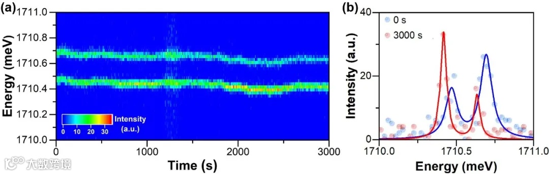 图3 | (a) 在激光能量调至带隙以下5meV进行激发时,单个CsPbI₃纳米晶的4K上转换荧光谱随时间的演化过程。(b) 从(a)中0 和3000s处提取的上转换荧光谱,具有的平均激子发射峰位分别为1710.58 和1710.52meV。