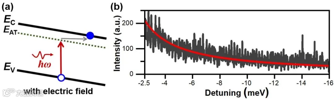 图2 | (a) 低于带隙能量的激光光子与单个CsPbI₃纳米晶进行作用产生上转换荧光发射的过程。EC:导带底;EV:价带顶;EAT:电致吸收尾带。(b) 实验测量得到的1D上转换荧光激发谱(黑色)及理论计算得到的Franz-Keldysh电致吸收尾带(红色)。