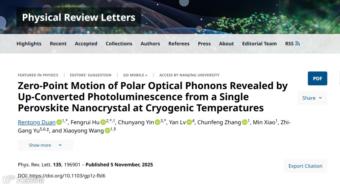 根据量子力学理论的预测,各类物理材料体系即使在绝对零度的温度下依旧能够保持基态上的能量振动。由于在半导体材料中普遍存在的热扰动,对该基态零点振动效应的观测是一项极其充满挑战性的工作。近日,南京大学与华盛顿州立大学研究团队合作,通过在4K低温下对单个CsPbI₃钙钛矿纳米晶进行近共振激发,成功观测到光学声子零点振动辅助的上转换荧光发射。相关工作以「Zero-Point Motion of Polar Optical Phonons Revealed by Up-Converted Photoluminescence from a Single Perovskite Nanocrystal at Cryogenic Temperatures」为题发表于Physical Review Letters,获选为Editors’ Suggestion文章,并被美国物理学会(APS)旗下的Physics杂志以Research News进行重点报道。