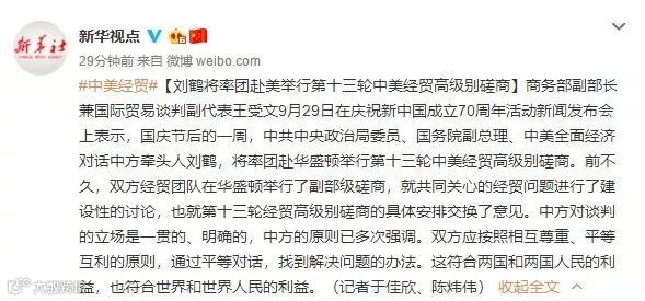 商务部副部长兼国际贸易谈判副代表王受文9月29日在庆祝新中国成立70周年活动新闻发布会上表示,国庆节后的一周,中共中央政治局委员、国务院副总理、中美全面经济对话中方牵头人刘鹤,将率团赴华盛顿举行第十三轮中美经贸高级别磋商。前不久,双方经贸团队在华盛顿举行了副部级磋商,就共同关心的经贸问题进行了建设性的讨论,也就第十三轮经贸高级别磋商的具体安排交换了意见。中方对谈判的立场是一贯的、明确的,中方的原则已多次强调。双方应按照相互尊重、平等互利的原则,通过平等对话,找到解决问题的办法。这符合两国和两国人民的利益,也符合世界和世界人民的利益。(记者于佳欣、陈炜伟)