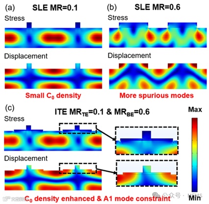 图2通过仿真结果,将采用倒T型电极的谐振器与采用传统单层电极的谐振器(其顶部电极的金属占空比均为0.1)的导纳曲线进行了直接对比,并展示了两种结构的示意图。 从图中可以清晰地看到,在非谐振区(例如3.5 GHz处),倒T型电极结构的导纳值相比传统结构提升了7.1分贝,这意味着其静态电容密度得到了显著增强。通过对曲线进行拟合计算,其静态电容密度从传统结构的3.2×10⁻⁵ pF/µm²提升至7.3×10⁻⁵ pF/µm²,增幅至2.28倍。更为重要的是,这种电容的大幅提升并未引入额外的杂散模式,器件的响应曲线依然纯净,证明了该结构在解决电容密度瓶颈方面的有效性。仿真分析表明,A1模式主要受质量负载分布的影响,而与电学边界的相关性较弱。倒T型电极结构正是利用了这一特性,通过低占空比的厚顶层电极来约束A1模式,同时利用高占空比的薄底层电极来显著提升静态电容。