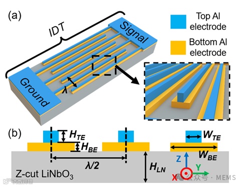 图1(a)倒T型电极谐振器的 IDT 区域的模型视图,(b)倒T型电极谐振器的正面视图。