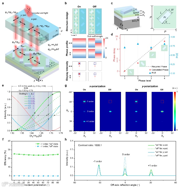 底层偏振转换:该层由精心设计的铝纳米棒阵列构成。这些纳米棒作为光学天线,其功能相当于一个高效率的“半波片”。无论入射光是何种偏振态(均可分解为X和Y两个偏振分量),该层都能将其一个分量转换为与之正交偏振分量,并引入一个特定的共振相位。上层动态相位调制:该层由介质纳米光栅和液晶组成。当光穿过液晶层时,会因液晶的双折射效应积累一个与偏振方向相关的传播相位(这里为X和Y方向各异的相位)。