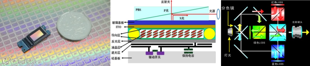 图2:左图:LCoS实物图(图片来自网络),中图:LCoS结构示意图(图片来源:DOI:10.19816/j.cnki.10-1594/tn.2020.02.073),右图:实现彩色投影的三片LCoS架构(图片来自网络)