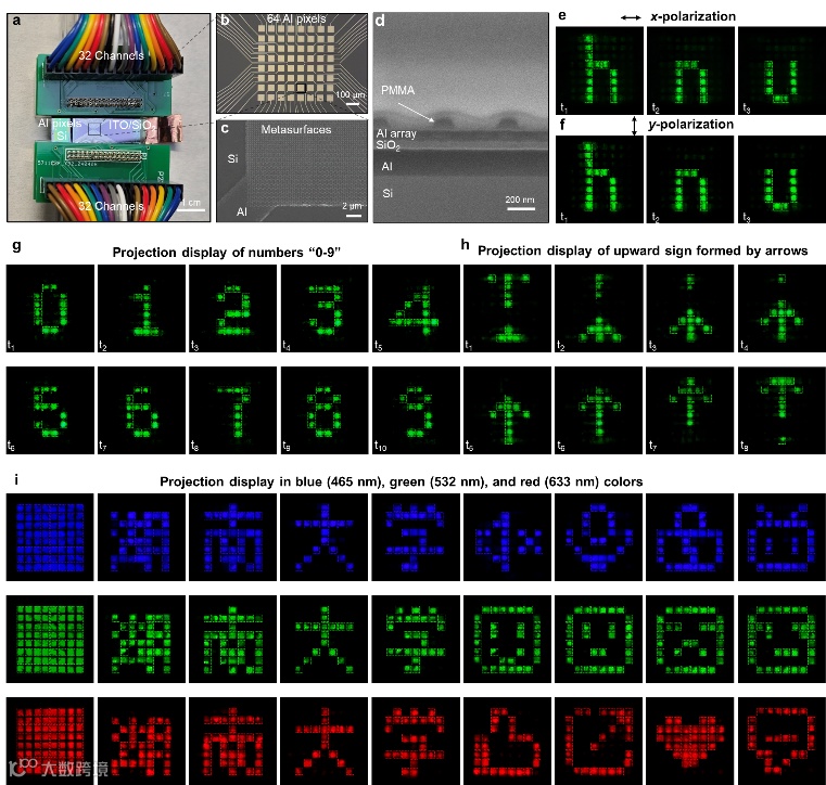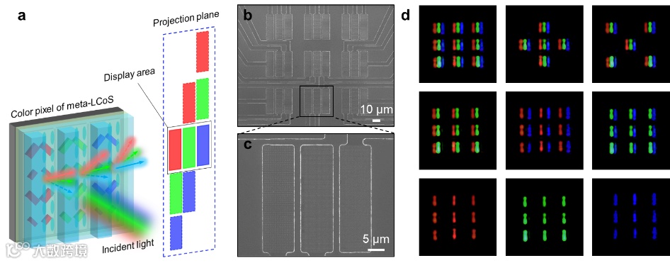 为了实现单片全彩显示,该研究将红、绿、蓝三色工作的超构表面子像素集成在同一个像素内。每个颜色的子像素都包含针对特定工作波长优化的纳米结构,通过精确设计纳米结构的周期,确保三基色光线都能以相同的离轴角投射出去,从而在投影屏幕上精准合成全彩图像。研究团队成功制作了9像素的彩色原型器件,演示了高对比度的全彩图像投影,验证了单片集成方案的可行性。