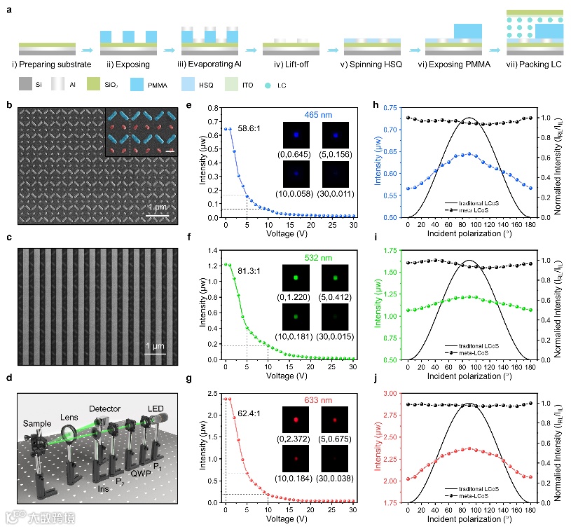 面对上述挑战,该研究提出了一种集成超构表面的偏振不敏感、单片全彩LCoS原型芯片(meta-LCoS)。这项技术不仅解决了偏振依赖问题,更在单芯片上实现了非时序的全彩显示,为下一代超紧凑、高效率微显示系统打开了新的大门。
