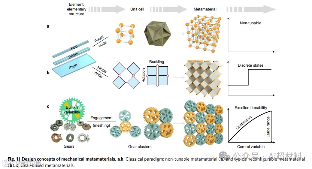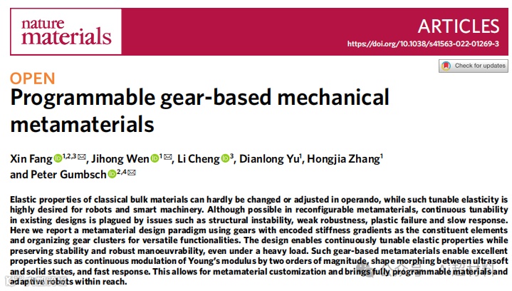 传统块体材料的弹性特性在使用过程中几乎无法改变或调整,而这种可调弹性特性正是机器人和智能机械所迫切需要的。尽管可重构超材料具备这种特性,但现有设计中的连续可调性仍面临结构不稳定、鲁棒性不足、塑性失效及响应迟缓等问题。本文提出一种采用编码刚度梯度齿轮作为基本单元、通过组织齿轮簇实现多功能的超材料设计范式。该设计在保持稳定性和机动性的同时,即使在重载条件下也能实现弹性特性的连续可调。基于齿轮的超材料展现出卓越性能:杨氏模量可连续调节两个数量级,实现超软态与固态间的形态转换,以及快速响应特性。这使得超材料定制化成为可能,让完全可编程材料和自适应机器人触手可及。 |
