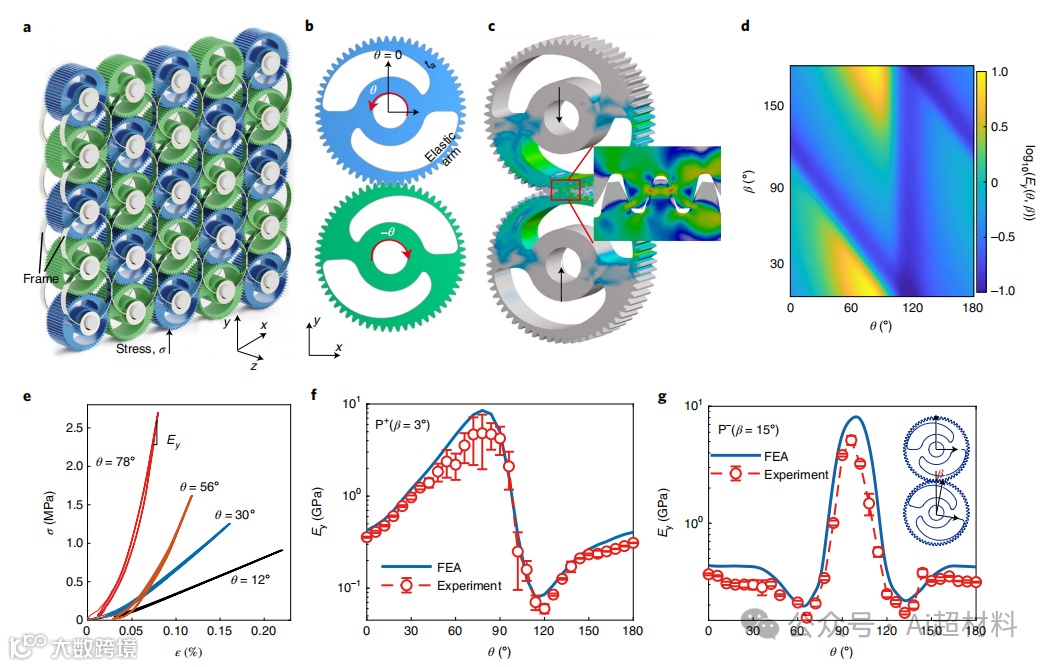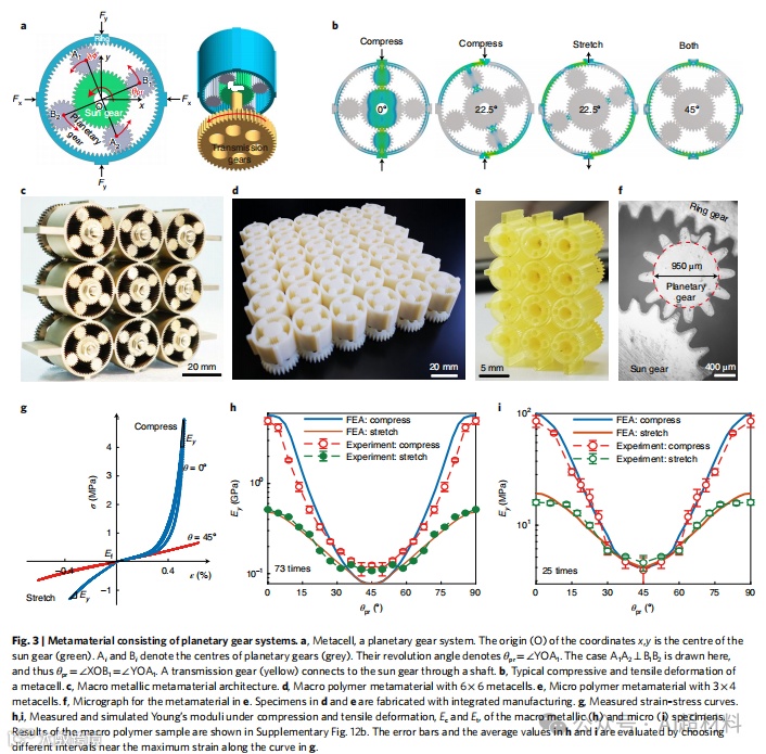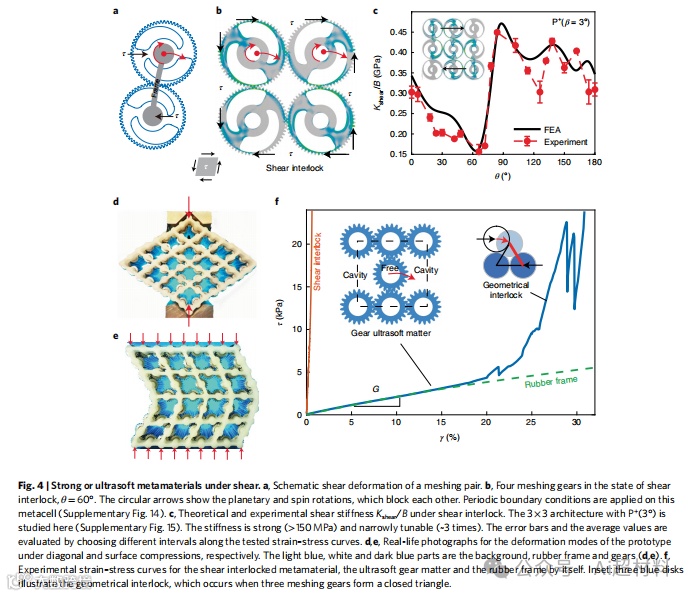 我们证明基于齿轮的机械超材料在保持稳定性、强度和高承载能力的同时,实现了原位可调谐性。这种可编程性具有鲁棒性且易于实现。齿轮簇提供了广阔的设计空间,使超材料的性能可定制化。除了已展示的杨氏模量、形状变形和冲击防护功能外,可调谐性还可扩展至其他弹性特性,如剪切模量、泊松比、强度、变形模式甚至阻尼系数(补充图21)。通过使用斜齿轮、将平面齿轮组装成如图3所示的分层结构,或合成不同类型齿轮(补充图22),还可构想三维超材料。集成制造技术将这些可调谐特性连接起来,生产出坚固的多功能设备43。以微米级超材料为例,借助高分辨率和大规模3D打印技术,可实现齿轮基超材料的进一步微型化和扩展。总之,本研究提出并展示了通过齿轮可变但强耦合的特性及内置可变性,构建可编程动态超材料的非传统设计范式。我们确立了总体概念,设计了原型,进行了力学分析,展示了宏观与微观尺度的灵活可调谐性及集成制造,并展示了其广泛的应用潜力。该设计范式拓展了全可编程材料的设计视野,从而为其实际应用探索提供了动力。 |