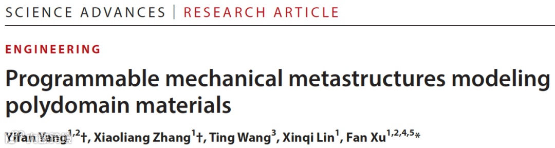 近日,复旦大学徐凡教授团队创制了可视化可编程拟液晶超结构,在宏观尺度成功重现了液晶弹性体等序构材料的微观变形响应,实现了多畴结构相变与反常变形的可视化编程调控。相关研究成果以《多畴材料的可编程力学超结构》(“Programmable mechanical metastructures modeling polydomain materials”)为题发表于 Science Advances 。