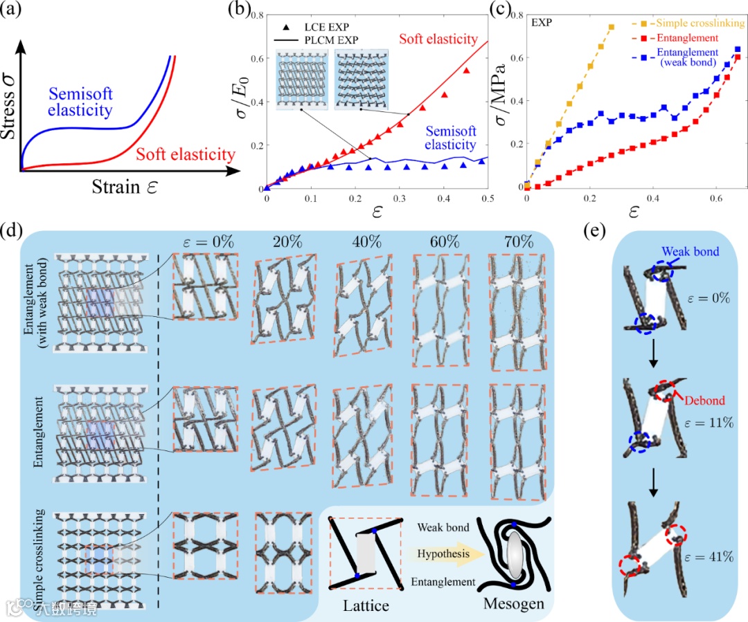图3. 软/半软弹性力学行为再现:(a) 软弹性与半软弹性曲线示意。(b) PLCM与LCE应力-应变对比。(c) 不同交联拓扑下的力学响应。(d) 微结构变形演化。(e) 缠结单元中软梁脱粘过程。