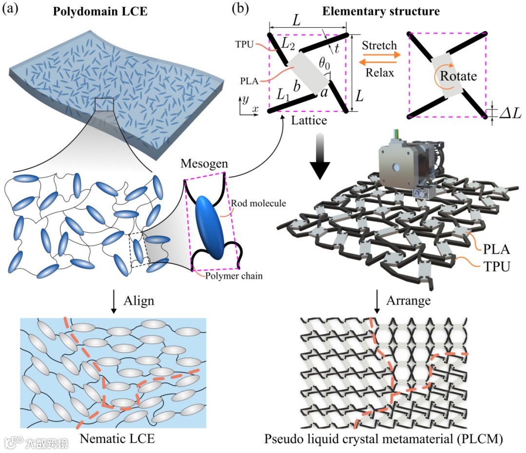 图1. 从微观到宏观的跨尺度映射:(a)液晶弹性体分子网络与畴结构示意。(b) 宏观拟液晶超材料设计及序构可编程构筑策略。