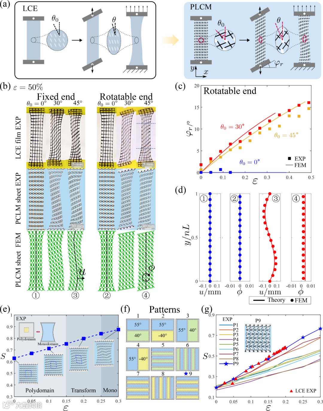 图2. PLCM薄膜力学响应与相变行为:(a)-(b) LCE与PLCM薄膜在不同条件下的拉伸变形对比。(c)-(d) 边界旋转角度实验测量与理论预测。(e) 拉伸过程中有序度变化。(f)-(g) 多畴分布设计及与真实LCE相变过程对比。
