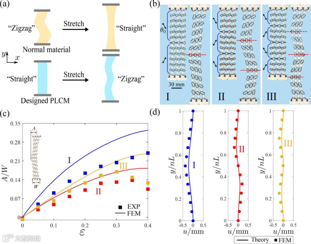 图4. 多畴PLCM反常变形:(a)-(b) Zigzag变形实验。(c) 变形幅值实验与计算对比。(d) 理论与有限元验证。