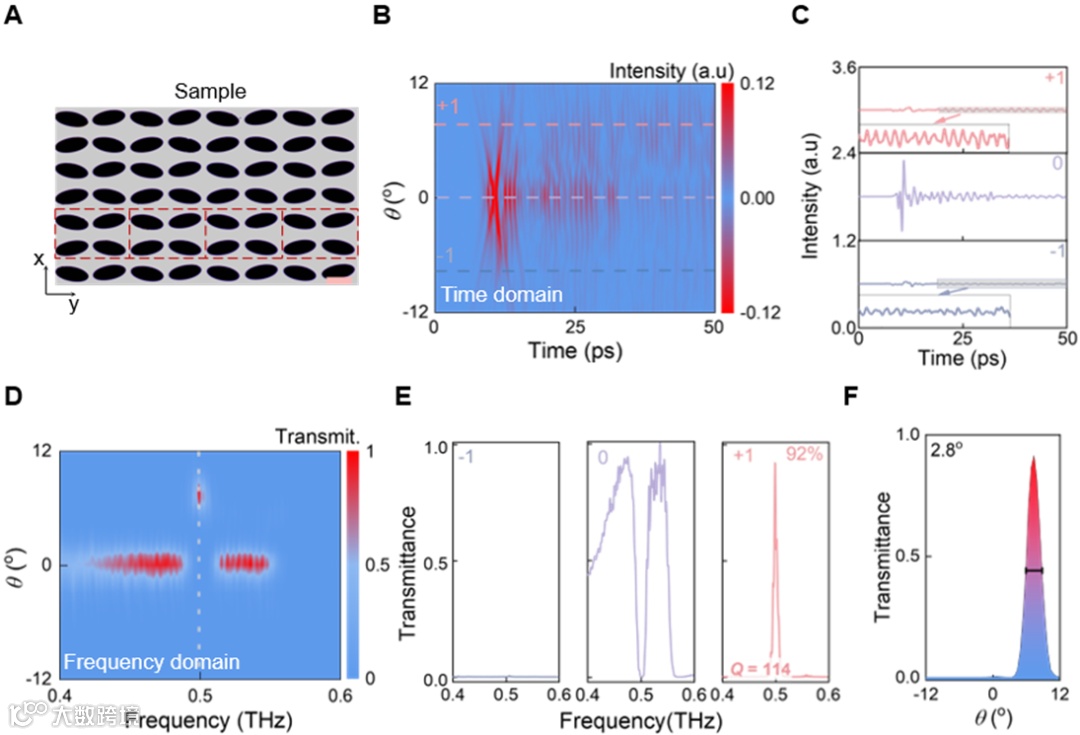 依托超高透射效率的单元设计,我们制备了仅需调控单一参数,即y轴周期的相位梯度超表面,并在实验中实现了卓越的太赫兹波束偏折性能(图4A)。角分辨时域谱测量显示,器件在0.4–0.6 THz频段几乎将全部能量定向至+1级衍射方向,偏折效率高达92%,同时在0级衍射处实现完全抑制(图4B-4E)。得益于q-BIC赋予的窄带共振特性,偏折光束呈现仅2.8°的超小发散角以及高达114的Q值,兼具极高的光谱与空间选择性(图4F)。如此将超高效率、自由支撑薄膜结构与窄带高Q控制集成于同一器件,在太赫兹波束操控领域前所未有,为下一代高性能、低能耗的光子器件提供了强有力的平台支撑。