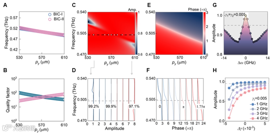 通过调控结构参数,使动量空间中双q-BIC模式的宽带简并成功转化为参数空间中的Kerker效应,并在宽参数范围内保持稳定共振特性。在y轴周期从530到610 μm的跨度内,两模式的Q因子仍高度一致,确保了卓越的结构鲁棒性。基于此,我们构建了相位差为π/4的八个典型单元,实现了平均高达99.3%的超高透射效率(图3A-3F)。进一步的数值分析揭示:模式频率偏差与损耗差异对器件性能至关重要,而多点简并显著增强了系统对频差与Q因子变化的耐受性,使超表面在广泛设计空间内依然能够保持高效率与完整的相位梯度覆盖(图3G-3H)。这一突破为高性能、宽容差的非局域超表面设计提供了全新途径。