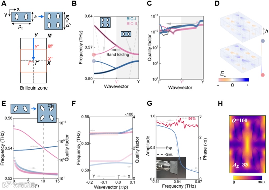 在这一新框架下,我们首次在动量空间实现了双模的宽带简并,即宽带Kerker效应。通过将矩形晶格的Y点模式折叠至Γ点,我们获得了兼具高稳定性与高Q因子的带折叠BIC模式(图2A–2D),使其在宽波矢范围内保持稳健的简并特性(图2B、2F)。随后,通过引入微弱结构不对称,我们精确调控远场辐射泄漏,使两条模式在0.542 THz实现频率与Q因子的同步交叉(图2E、2F)。最终构建的硅基薄膜超表面在实验中表现出超过96%的高透过率、完整的2π相位覆盖,以及高达33倍的局域场增强,为宽带Kerker效应的高效率、高品质因数的实现奠定物理基础(图2G、2H)。