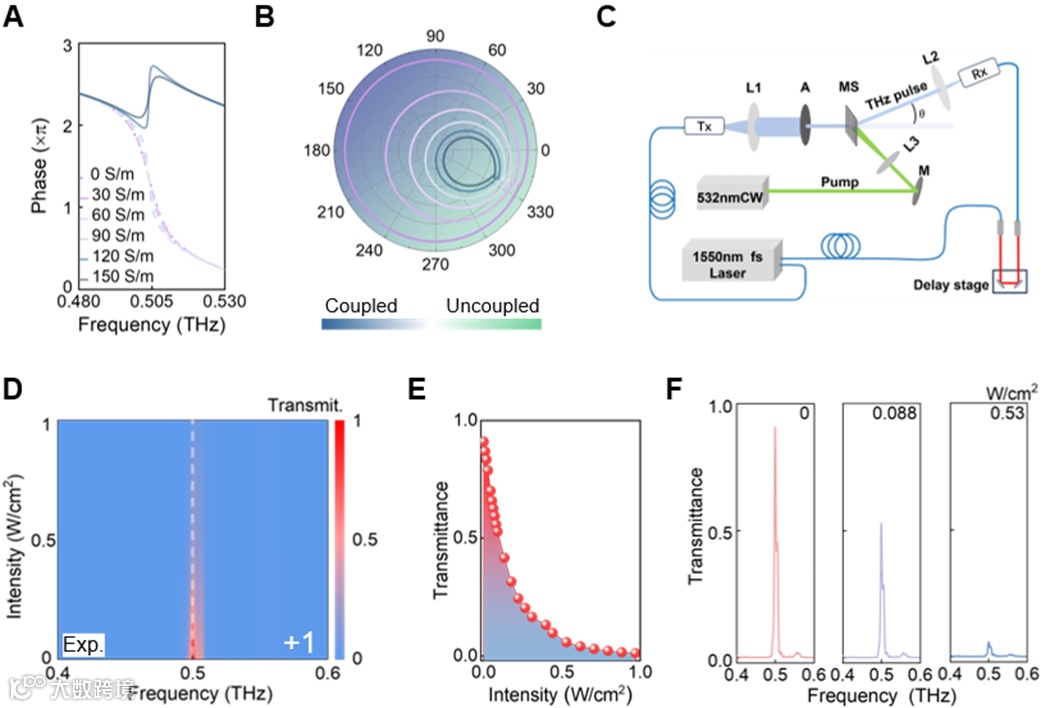 本研究通过实验验证了高Q值+1级衍射光束的低阈值调制能力。双q-BIC简并确保了在低损耗条件下实现完整的2π相位覆盖,而损耗反转会触发明确的相位跃迁,从而影响Kerker效应的保持(图5A)。在仅0.53 W/cm2的连续光泵下,衍射强度从92%降至5.8%,调制深度高达94%,远优于未图案化硅薄膜的不足7%调制表现(图5B-5F)。实验进一步表明,该平台在脉冲激光激发下具备低阈值特性,展示出利用BIC提升Q值、实现更窄带选择性与更低调制能耗的巨大潜力,为下一代高速、低功耗太赫兹调控器件奠定基础。