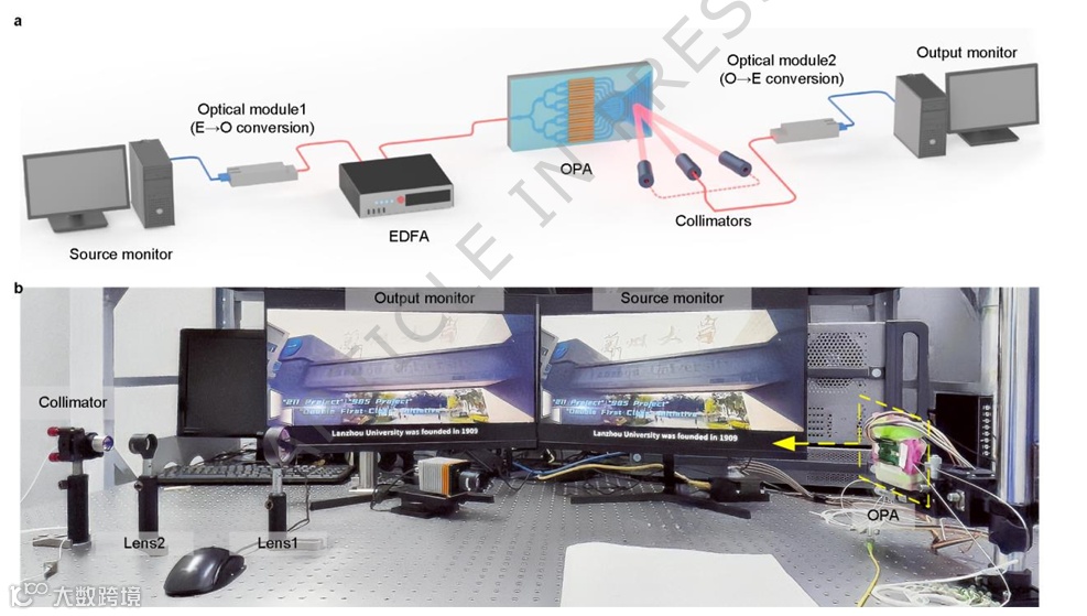 兰州大学田永辉教授团队提出并成功演示了一种基于薄膜铌酸锂光学相控阵的全固态、芯片级多目标超高速光无线通信系统新方案。该团队设计的系统利用薄膜铌酸锂光子集成芯片实现光学相控阵,从而无需任何机械移动部件或透镜即可完成实时、动态的多目标光束连接与追踪。在通信性能上,该系统采用16-QAM(16-正交振幅调制) 格式,实现了高达320Gbps的单通道数据通信速率,这一指标显著超越了现有5G及当前6G提案的峰值能力。研究团队通过稳定传输未压缩的高清视频流验证了系统的可靠性与实用性。此项工作开创性地将芯片级集成、前所未有的超高数据吞吐量与动态多目标支持能力融为一体,为下一代超高速无线通信技术发展确立了全新范式。