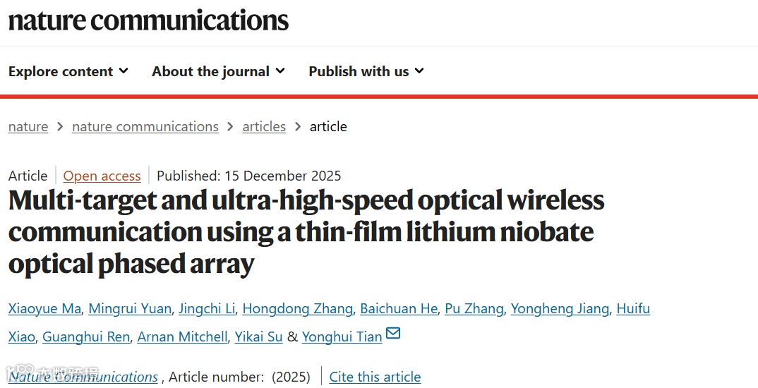 研究成果于2025年12月15日以题为“Multi-target and ultra-high-speed optical wireless communication using a thin-film lithium niobate optical phased array”发表在《Nature Communications》上。