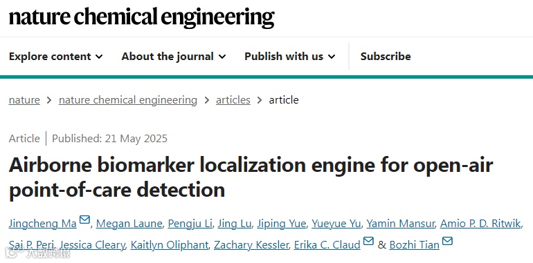 近日,美国芝加哥大学化学系田博之团队与医学院Erika Claud团队开展跨学科合作,共同开发了基于气相-液相转换的ABLE检测平台,通过创新传热传质过程实现了空气中标志物的快速富集,从而可以在未来实现快速、便捷、灵敏的空气检测技术。2025年5月21日,该工作以“Airborne biomarker localization engine for open-air point-of-care detection”为题,发表在Nature Chemical Engineering期刊上。前田博之团队的博士后,现美国圣母大学航空机械系、生物工程系的马景铖助理教授为文章的第一作者以及共同通讯作者。